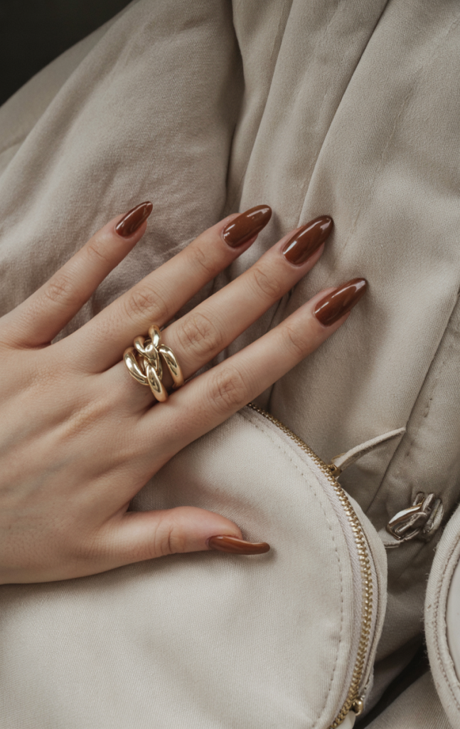 The almond shape increases the glamor and the complete mirror shine maintains it modern. Such a style is wonderful to the events or everyday luxury and this style compliments the brown, orange, or rust-coloured outfits very well. That is the feeling of 2025: minimal effort with a great impact.