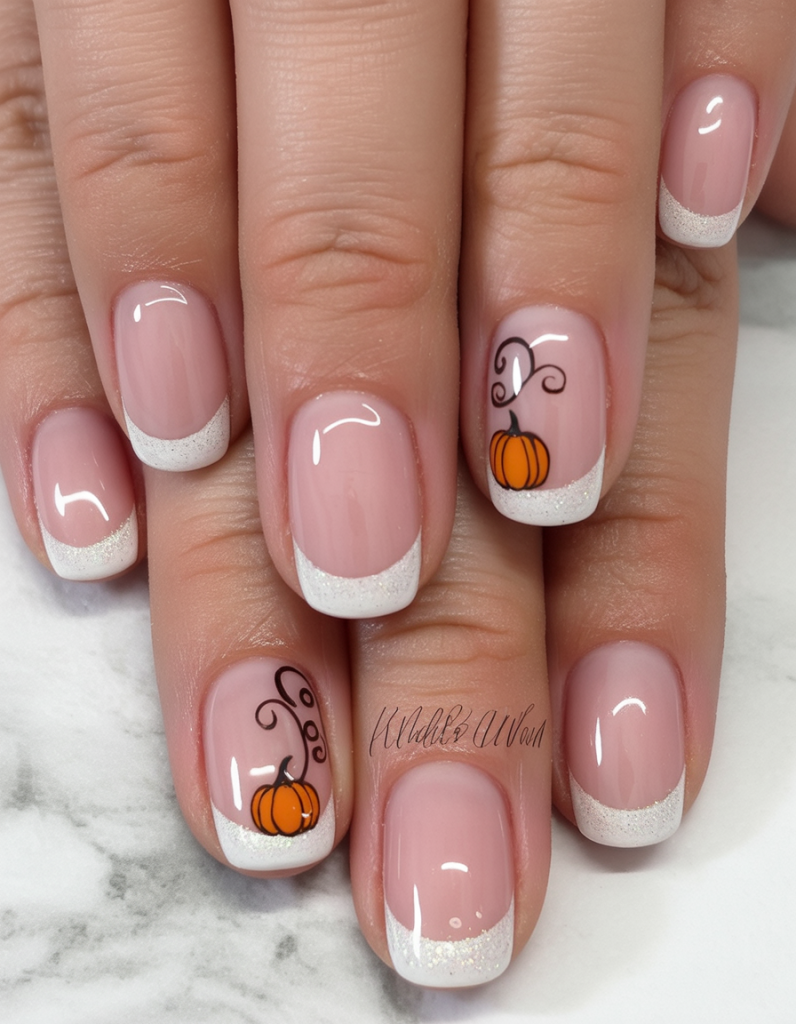 There’s something irresistibly charming about this playful nod to autumn whimsy. It begins with a fluffy pink which then gives way to vintage white french tips with a hint of low glitter- all that looks like frost strokes on a pumpkin field. The actual fantasy element is the small hand-drawn pumpkins which include the just-right festivity without being too much. It is the manicure which states, Yes, I drink in pumpkin lattes, but in a chic way.