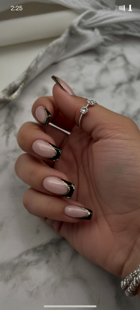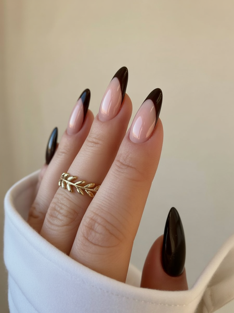 Ready to turn heads this fall? These stylish and extrovert high-gloss black tips do not follow the trends and are daring and smooth. The eye-catching contrast between the black inky shade or a natural base on nails of a almond shape is a source of immediate upscale. It is gloomy, contemporary and even your fingers will look business-like.