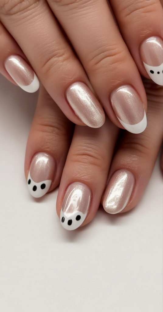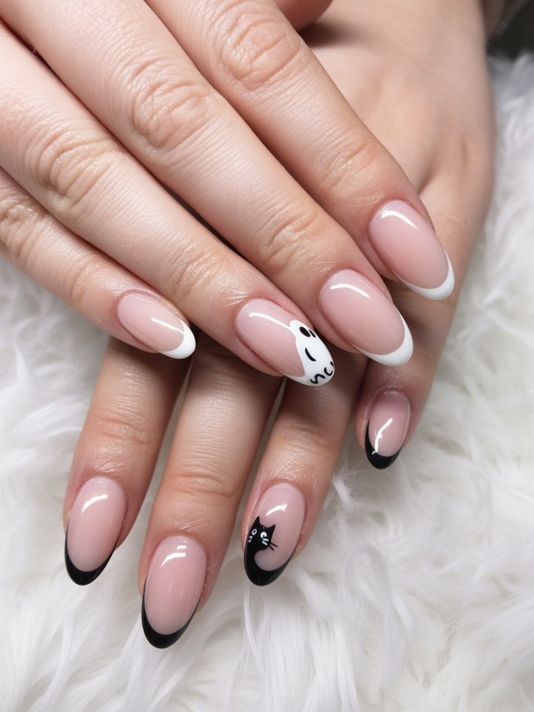 The whimsical nature of fall is eminent in this spooky cute combo of classic french tips, black cats, and flirty ghost art. The black between the hint of the white tips keeps it down to earth whereas the small faces on it only include a hint of Halloween without being completely in costume. It is the design that resembles a seasonal rom-com of your choice festive, fun, and absolutely stylish.
