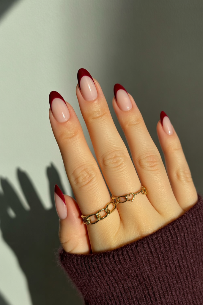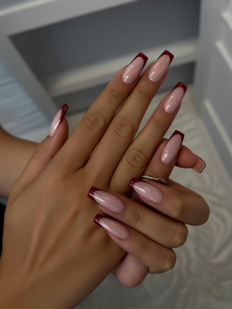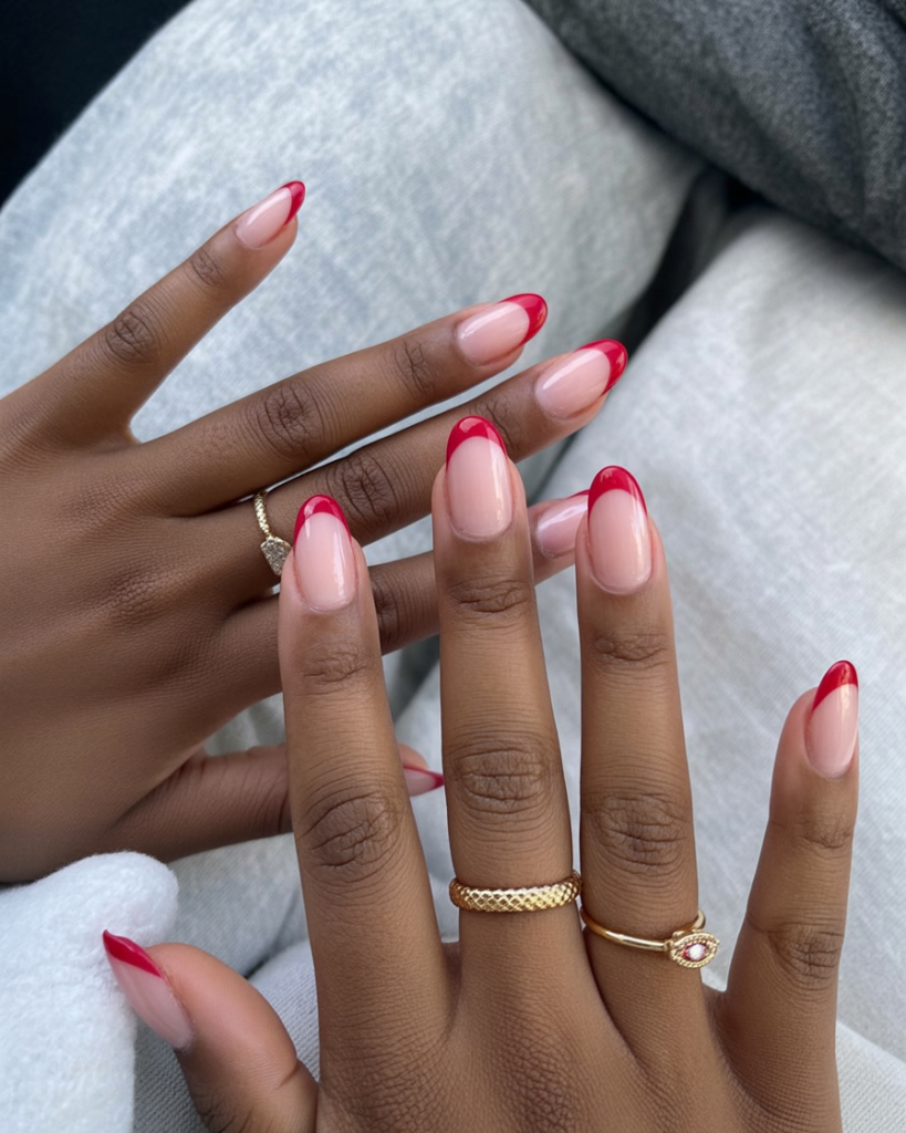 This fire and unashamedly feminine red-tipped french manicure serves boldness in fall without uttering a single word. The scarlet swoop is of very high-gloss and conveys a contrast exquisitely against a soft pink ground, which is romantic, self-possessed, and a bit playful. Candle lit dinners, red confident lip and a knowing smile.