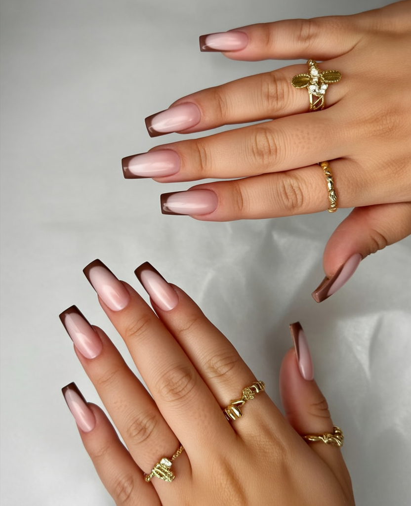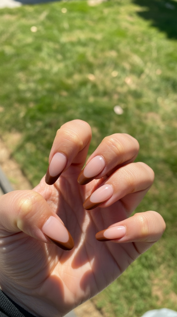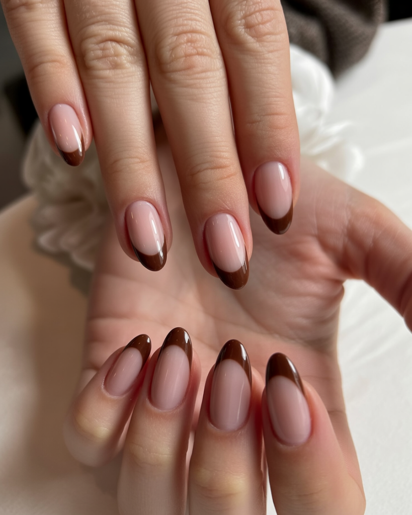 This is a deep brown french tip that looks like you put the palms of your hands around a hot latte under the clean golden light of early fall. The shiny almond silhouette is classic and modern at the same time, and the deep color is suggesting autumn walks and warm sweaters. It is the manicure of the best of trench coat and oversized scarf.