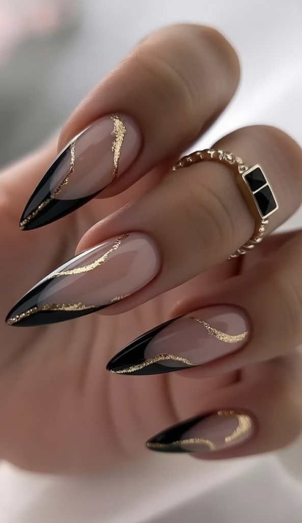 The bold black stiletto nails with molten gold swirl shapes are something to catch some attention. They appear to be fine jewels engulfed in autumn darkness–artistically pronounced, vast and uncensorious glam. And should your fashion tend rather toward the extreme, this is your hour.