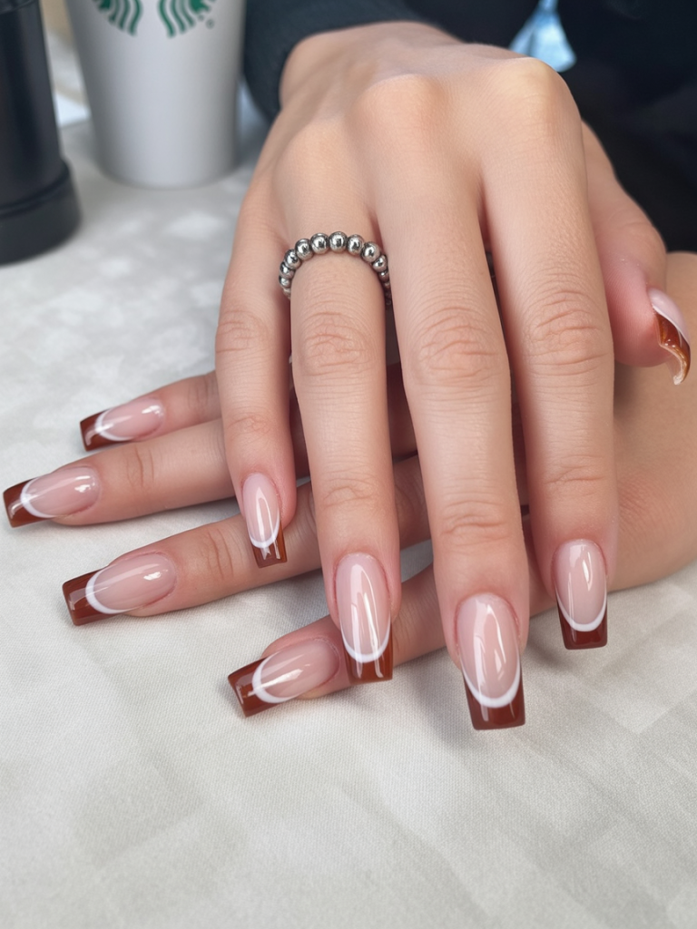 If you’re looking for fall french tip nails 2025 that channel both sass and sophistication, this rich cocoa tip outlined with a crisp white edge is your answer. It has an editorial squared coffin shape, which makes it have that structured edge perfect on anyone who wants to have a little drama in this season. Think of this nail color showing through the sleeves of a thick knit sweater when you are holding a caramel macchiato in your hands.