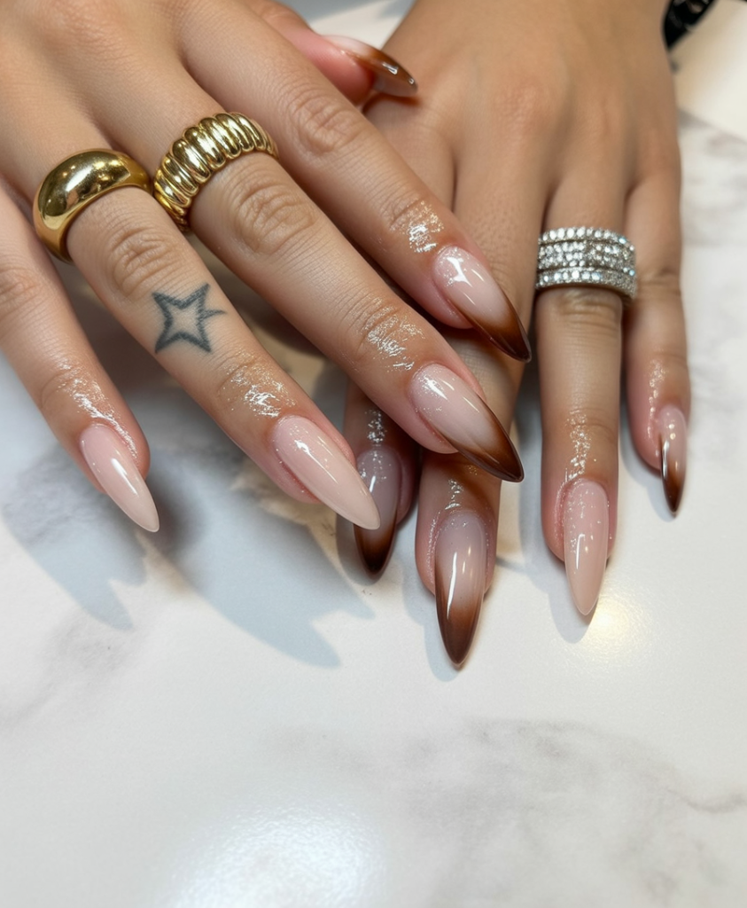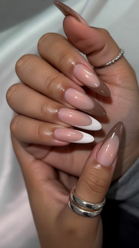 This neutral, pourable, dream of a almond-shaped gradient is simply elegant, minimal and has no end to how many times it can be worn. These alternating brown and white tips blend into the pink base that is very sheer and makes the entire look look very polished and editorial. It is as comfortable as can be or kingly and at the same time, not too stuffy. Perfection when you are looking to feel like you are sufficiently together but without making an effort.