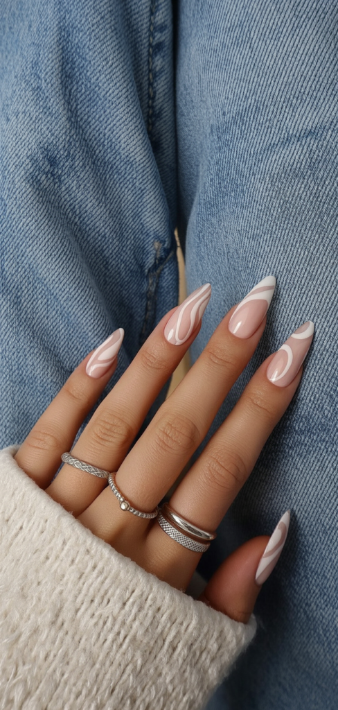 New and appealing in art, these long swirls of white flecked on a gentile pink foundation have a dash of motion and artistry to your fall look. It has a manicure that speaks that you do like things minimal, though still need it to be interesting. There is no stark contrast but only a little playfulness as in the texturing of a neutral palette outfit.
