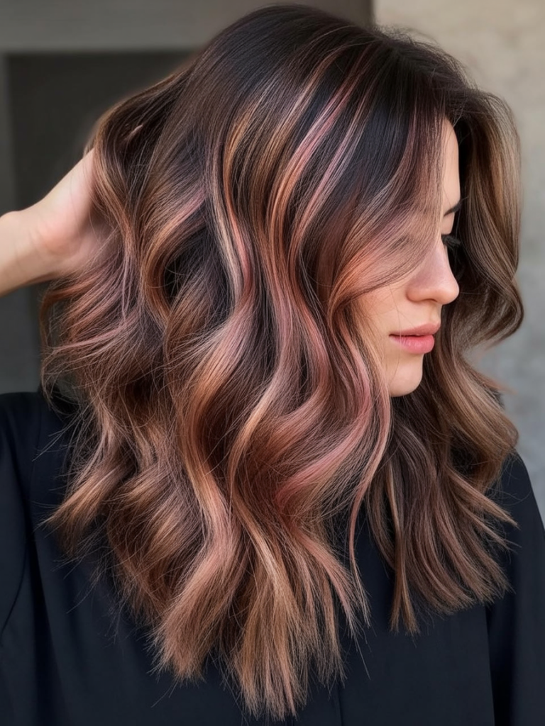 It is something dreamy about this combination of deep brunette and delicate rosy coloring. It is as though the color of your favorite fall sunset is bottled in every one of the waves and one filled with effortless feminine energy. Wonderful glow of the rose gold intertwined with hair is made to fill the image with gentle heat, grace, and the brush of something mysterious and lighter at the same time, something that is set to be completely in tune with chunky scarves and falling leaves.