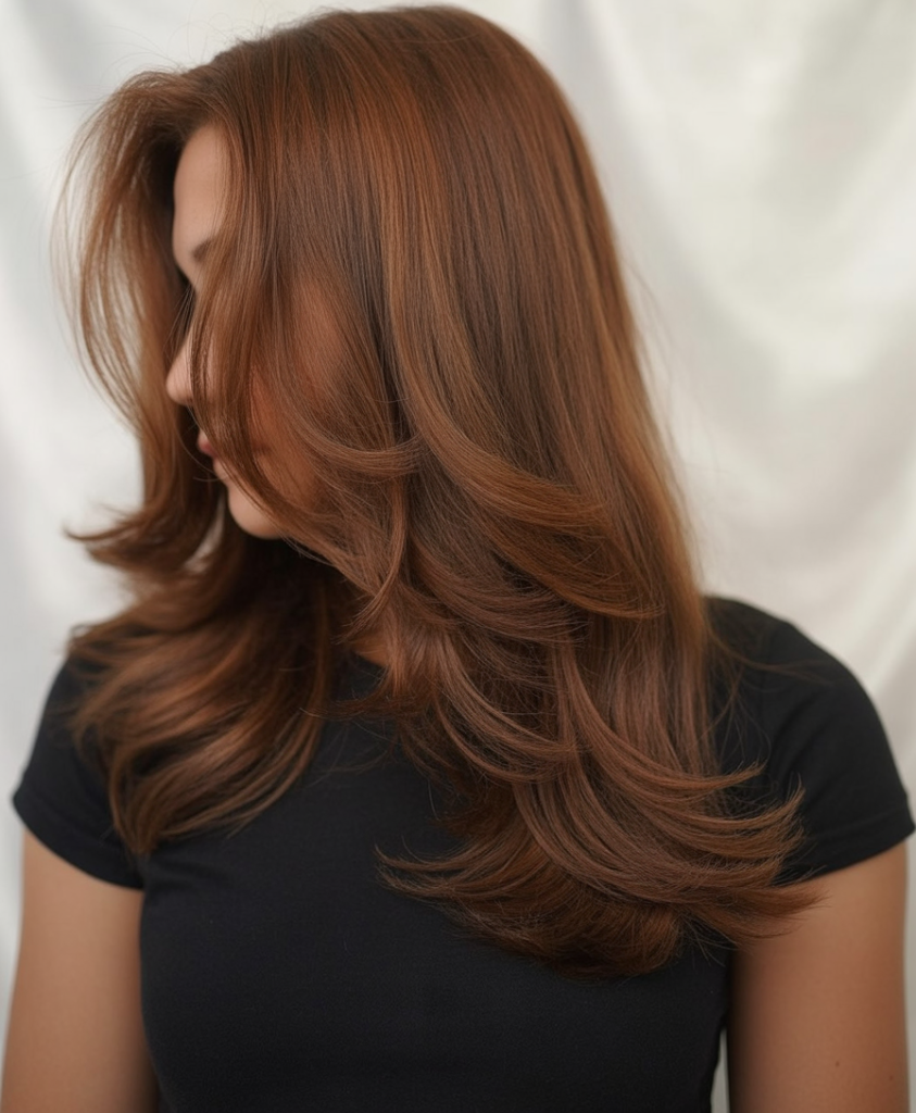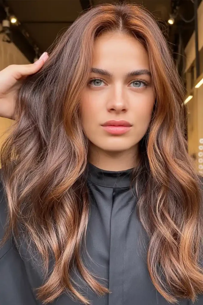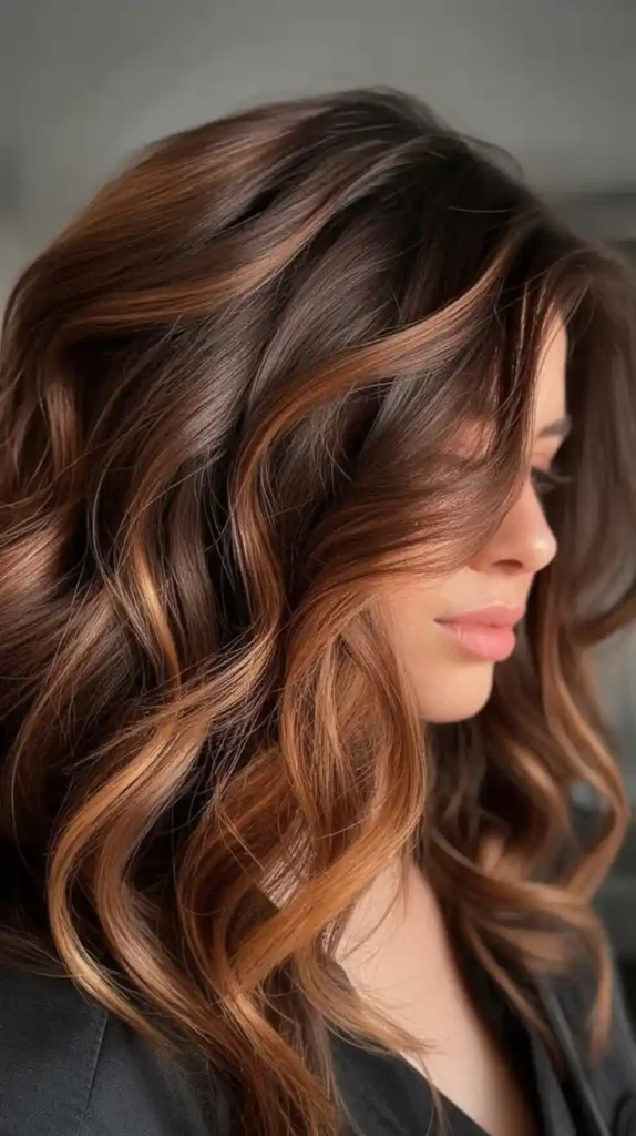 It is the best selection in lengthy and chunky hair that can bear layers and volume. It particularly suits round and heart-shaped face, and goes down the face with its soft contour and fluid feel. Being among the best trends of brown hair 2025, this set of colors is both classy and charismatic. It will be shiny throughout the season with curl-enhancing cream and a shine serum.