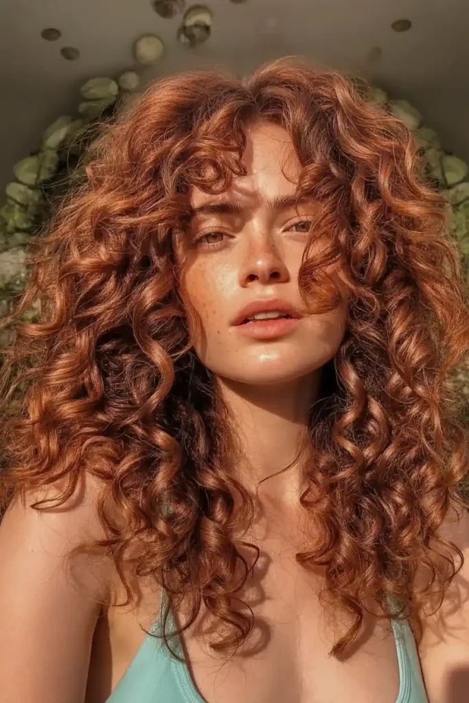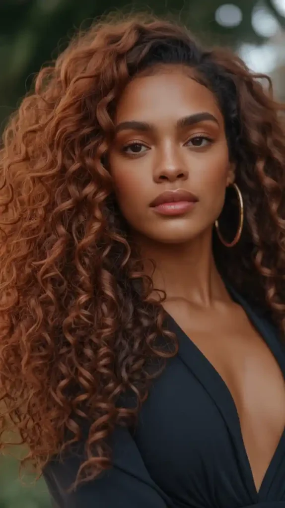 The copper curls are voluminous and absorb the autumn sun as the falling leaves in a movement. The natural shades of the skin are enhanced by the warm coloring, and the well-defined ringlets provide significant main-character vibes. It is loud, fun fair and completely nature-related through and through, as though you walked through golden woods in form of hair.