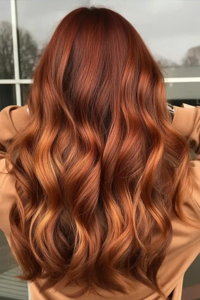Seen here is this rich fall hair color with blend of cinnamon and auburn hair coloring done in long movie-star curls. It’s warm, spicy, and has that nostalgic pumpkin-patch-meets-Hollywood-glam appeal. The layers create a feeling of softness, and the use of bright colors creates the impression of a shining living entirety.