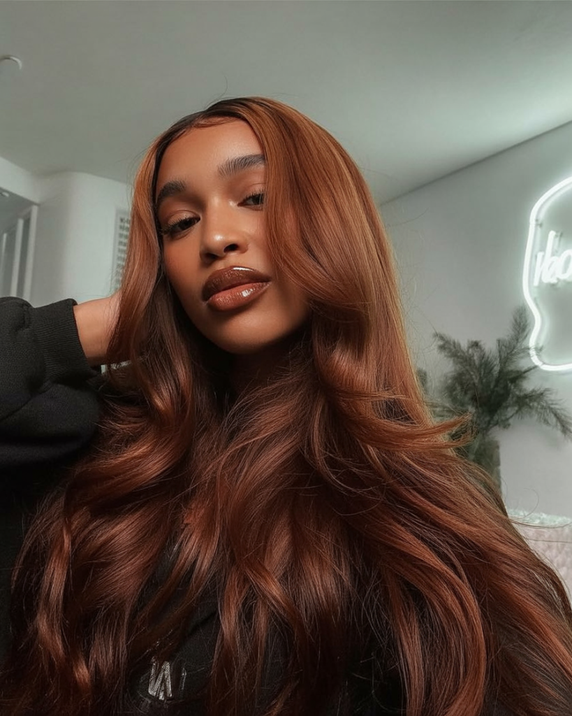 If you’re after sophistication with just a hint of spice, this chestnut base with soft copper streaks is calling your name. The change of color is light enough to be natural and vivid enough to take the light, particularly in motion. It’s the kind of fall color that doesn’t need effort — it just works.