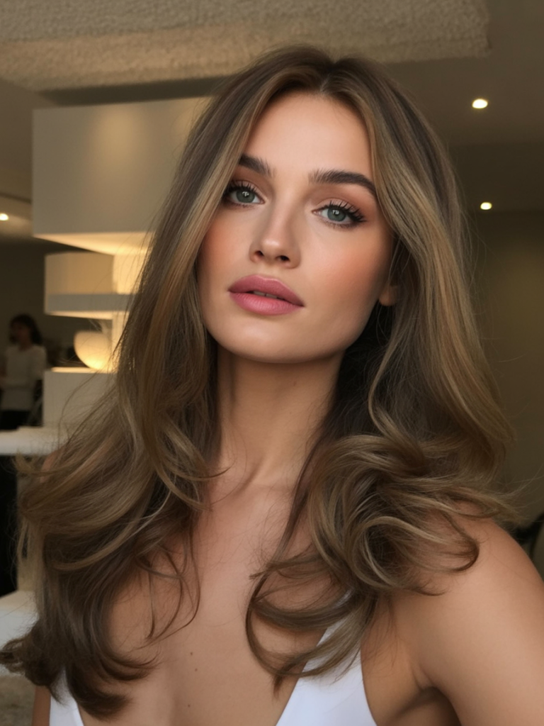 The color concept is brilliant when used on medium thick and naturally textured hair (wavy or lightly curled). It plays well with layered cuts and enhances movement. It is one of the most flattering brunettes 2025 trends, which suits well brunettes who tend to flirt with light without becoming blonde. Apply a curling wand and color protecting shine to bring out the maximum effect and deep shine.