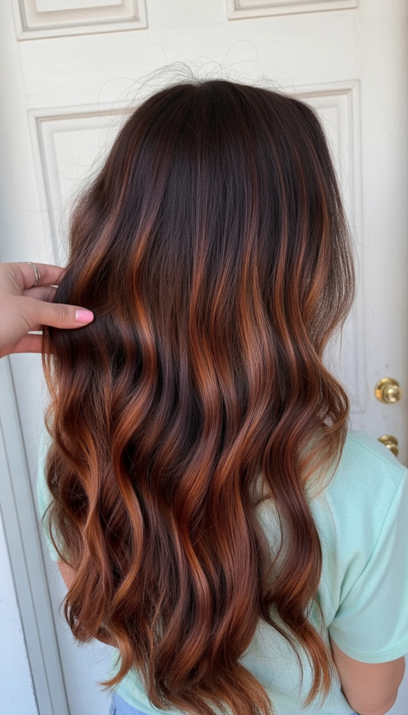 Warm, cinnamon-kissed strands melted into dark brown roots, were fall any flavor. The color exudes coziness and cinnamon, such as when you put on your favorite sweater with something pumpkin-spiced. This is an autumn dream with the interplay of honey, copper and caramel.