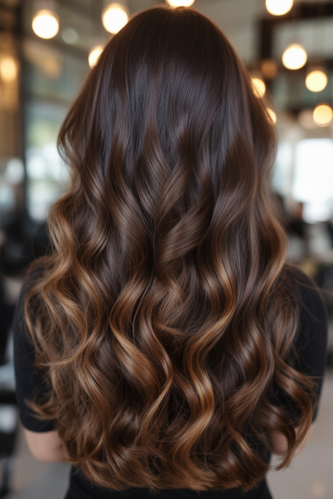 There’s something timeless about this glossy chestnut shade—it’s rich, elegant, and looks absolutely luxurious under warm indoor lighting. With those dimensional curls the color is made alive, repeating almost like melted chocolate with caramel rores wrting through.