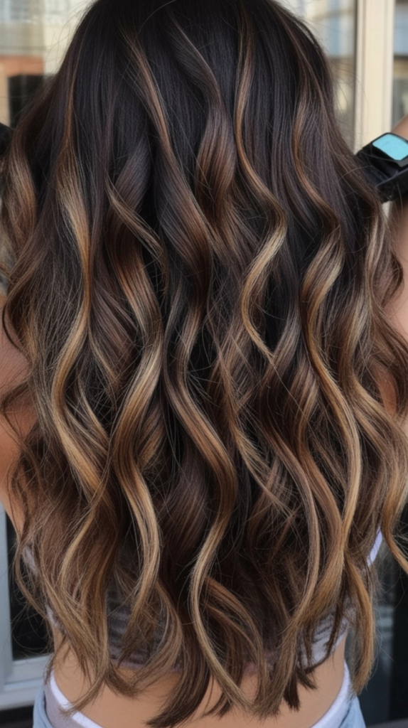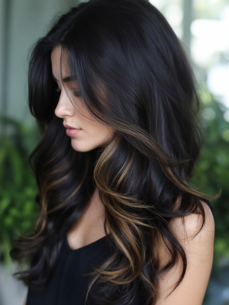 Such contrast between a deep black and golden highlights emanates a lot of confidence. It is a glamorized high shine style that captures attention, without ever bothering to raise her voice, especially to the confident brunette who needs to get behind the trend of the 2025 drama in terms of color dimension.