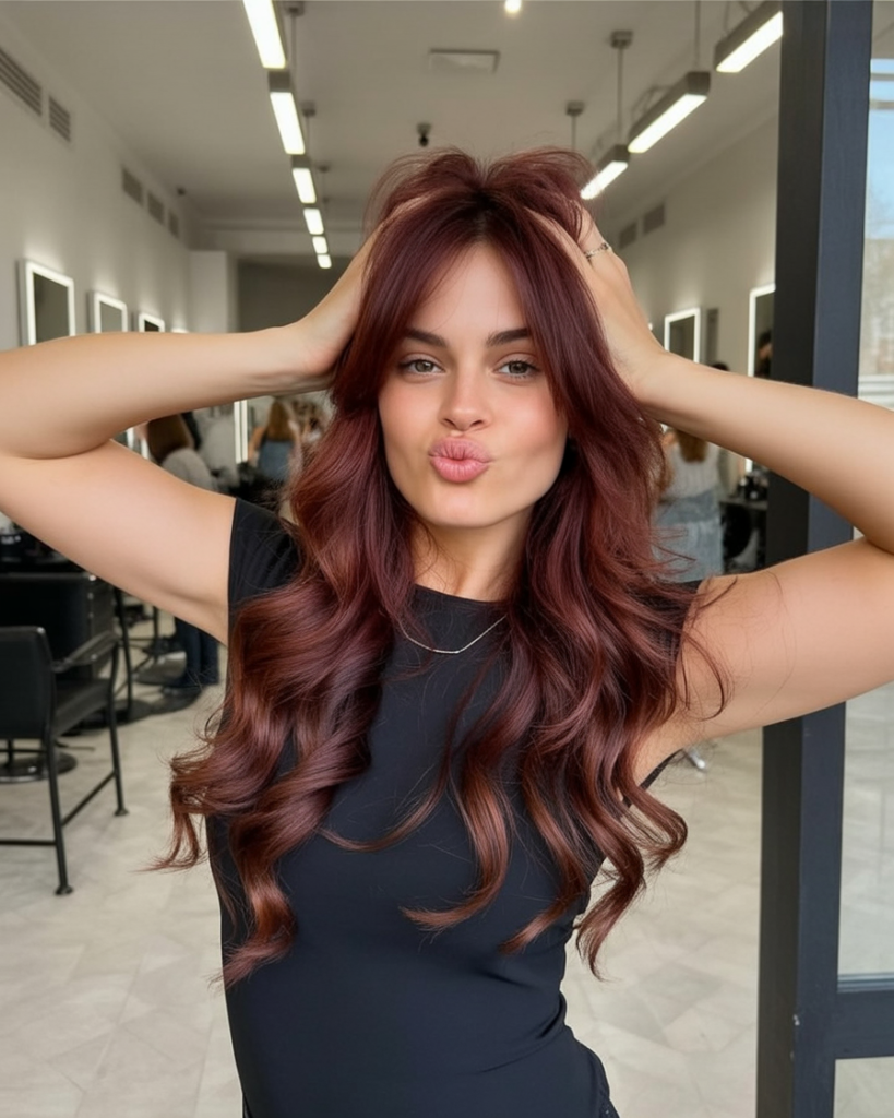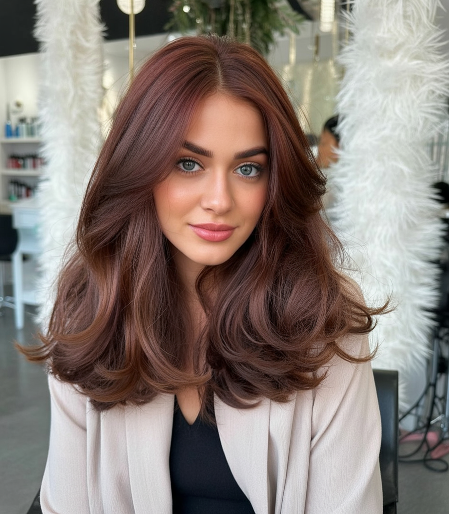 Flaunt-free and drama-free red-kissed mahogany, the smooth, natural grain is seamless and deep in its finish. It whispers elegance rather than shouting for attention. Combined with an impressively large 90s-style blowout, it is at the same time retro and incredibly 2025.