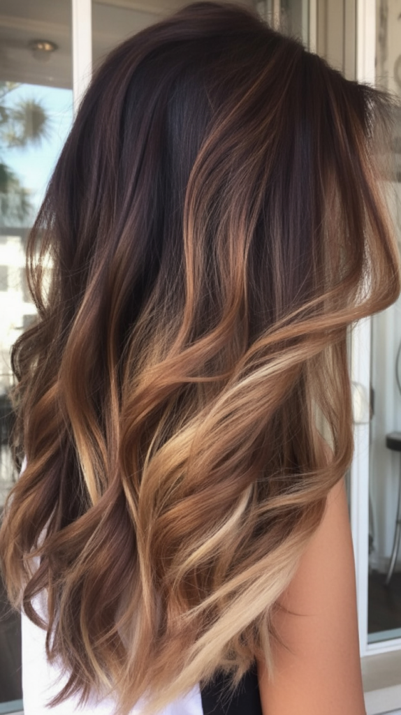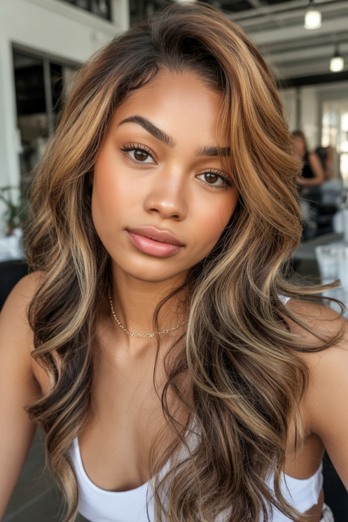 If you’re rocking 2025 medium length or longer hair, this balayage is a game-changer. It sits perfectly with curl or straight textures and would show perfectly with ample skin tones. Tell your stylist that you want layers that have been painted on the hand, they melt into your natural shade- this process involves low maintenance touch ups every few months.