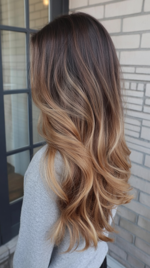 This warm balayage fades down deep mochas to gold honey and is soft ombr effect that glows as light of the morning on a fresh fall morning. It is the type of look that can be considered casual yet never dull- simply a pinch sun-kissed and not forgetting that cozy and fall look.