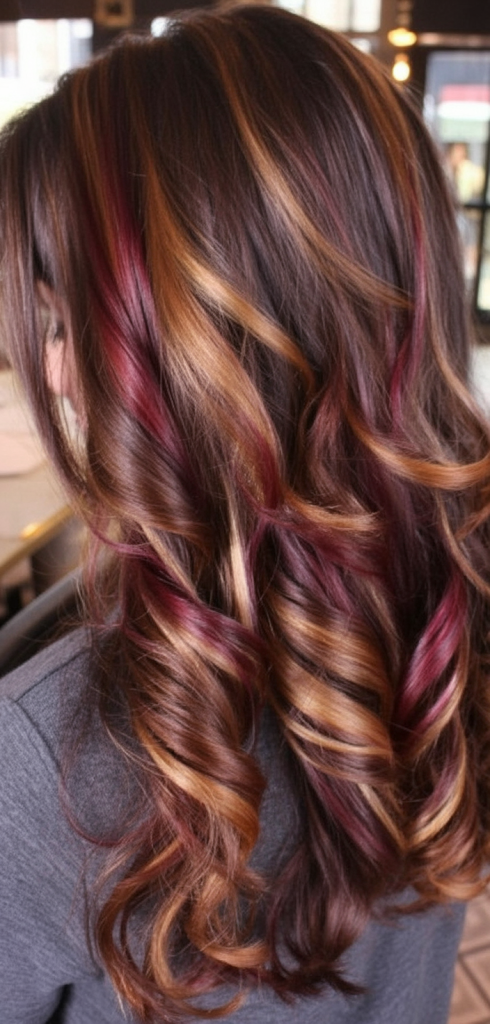 A blend that is recommended to thick wavy haired women, the color will give volume and lots of movement to the hair. The burgundy ribbons can best fit the brunettes who wish to achieve a 2025 look without turning bleach blonde. To maintain the waves big and bouncy throughout the season use a curl-defining product or a wide-barrel iron.