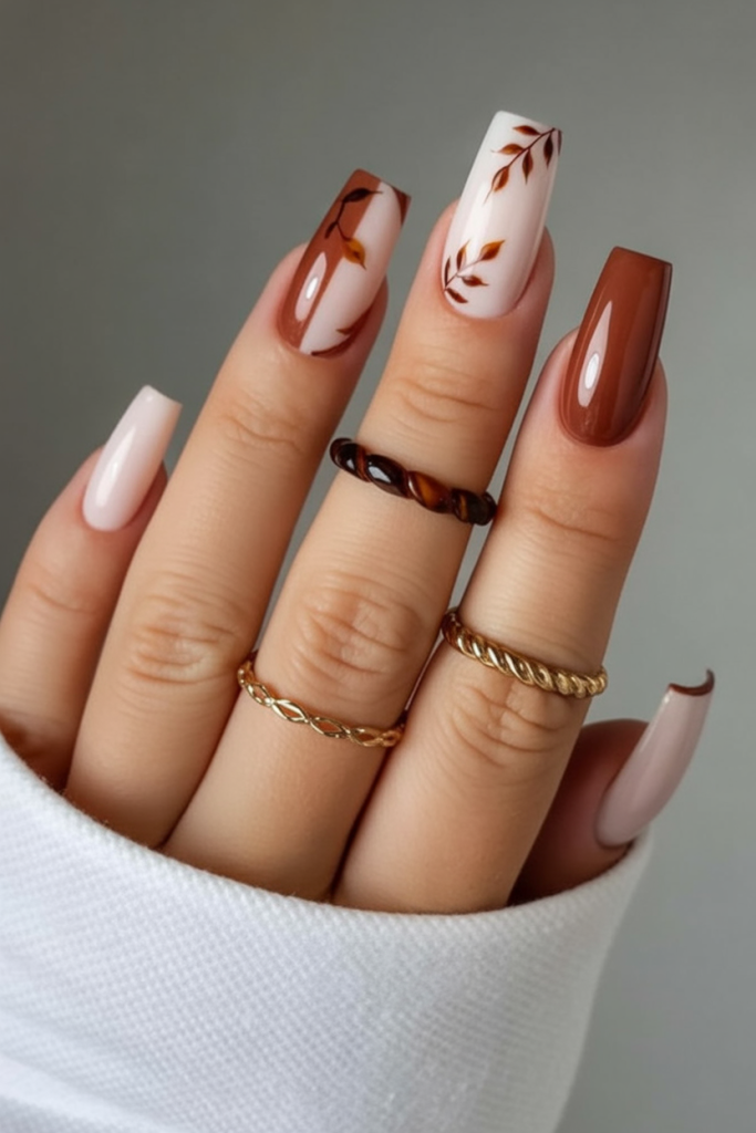 These nails are the same as a brisk fall breeze that blows over a warm knit sweater. It is just that the neutral and cream soft-tones are in harmony with warm colors ofbrown and amber, each of the nails with a little leafy design that gives any idea of a stroll through golden woods immediately. The shape of the coffin is also fine and tapered that keeps the appearance smart and adult.