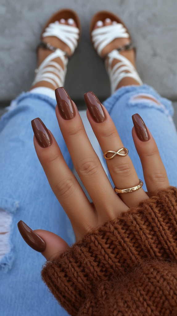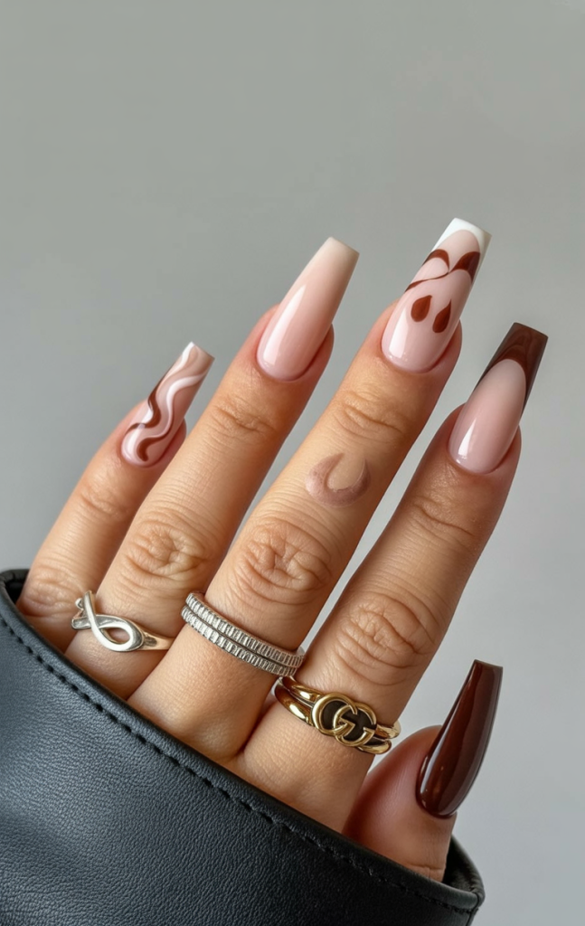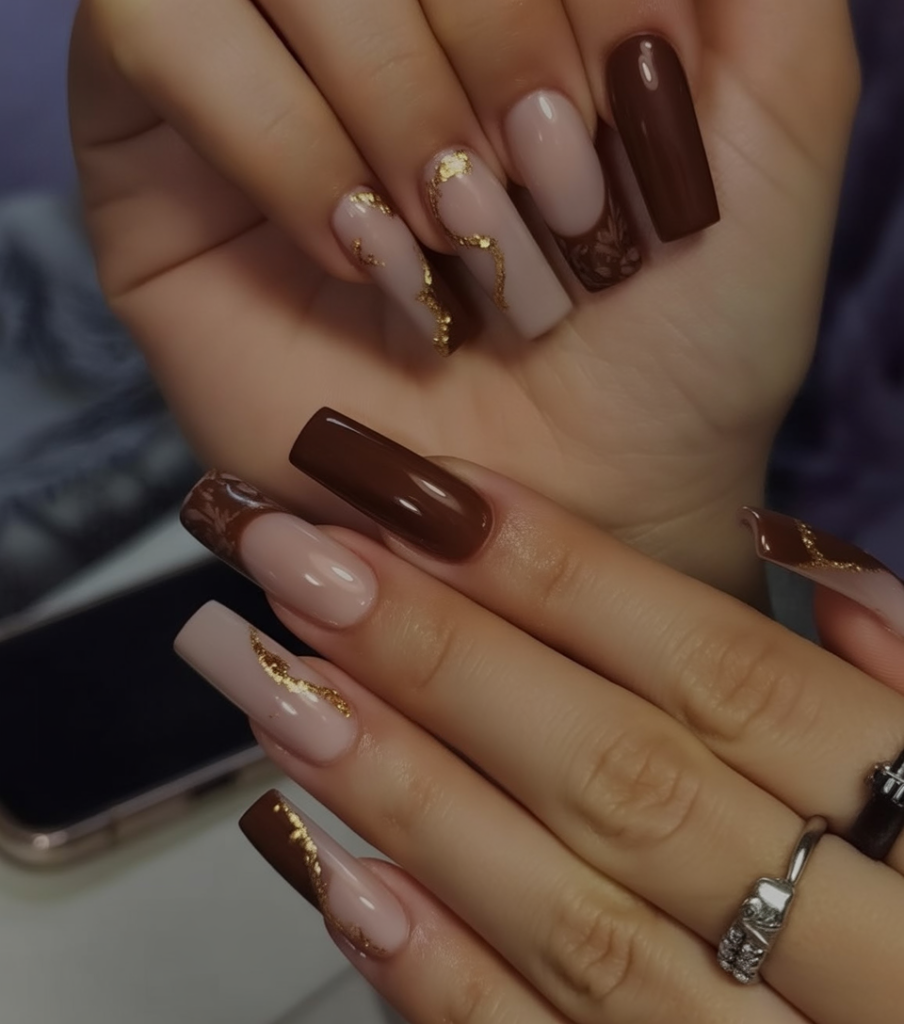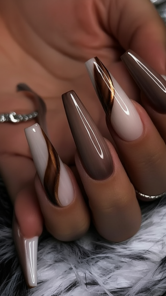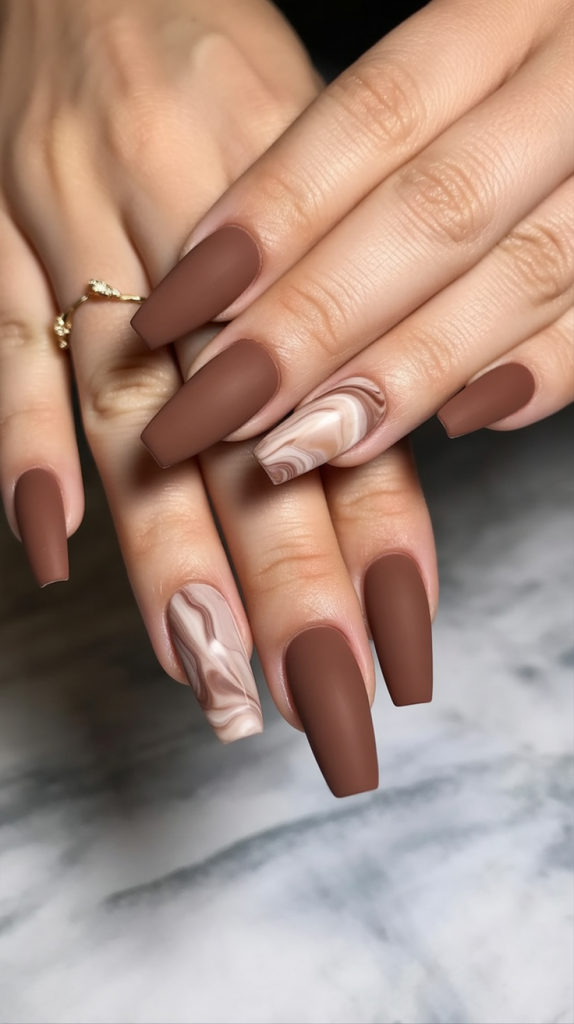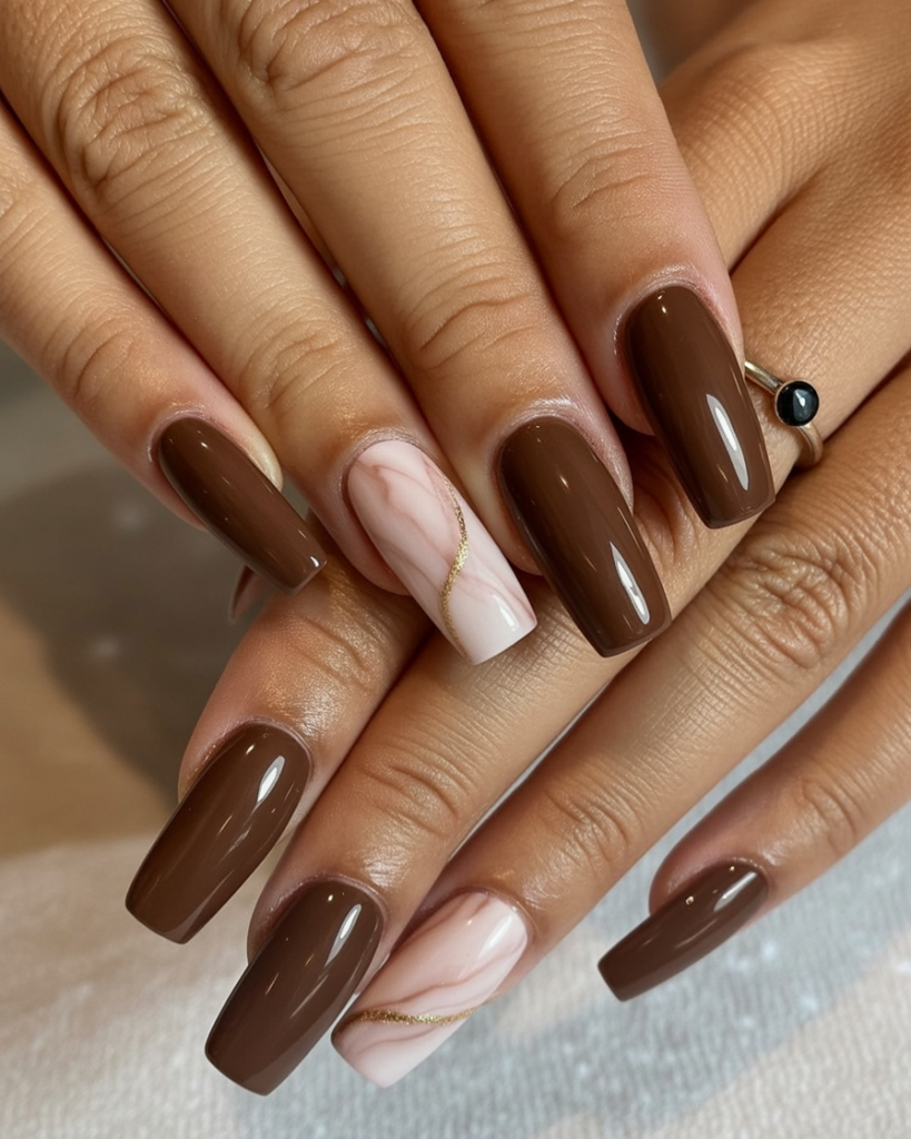 This appearance is like taking your favorite caf mocha at the nippy autumn morning. The underlying color is a dark brown and warm in tone, and then the accent nail has a creamy marble with a soft swirl and light golden ribbon as a touch of glamour in the air. The outcome is streamlined, assured and is ideal on cooler weather fashion.