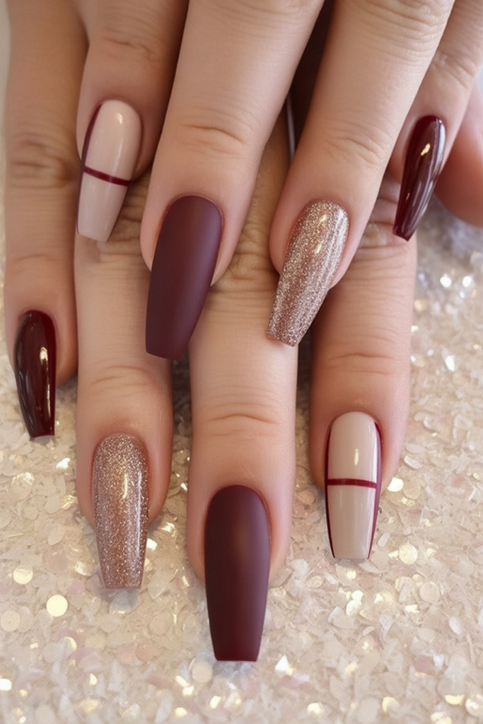 The three vintage pieces used in this set include deep red, champagne shimmer and classic linear stripe. The matte burgundy is fancy, the glitter is not so much and those shiny horizontal lines on the neutral nails glue everything together. It’s refined but with personality.