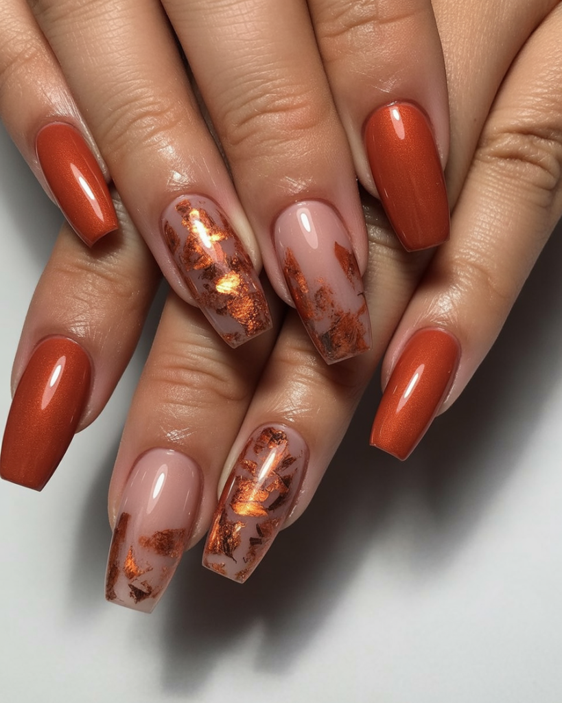 This is just right if you are a lady who desires something to make a statement but still enjoys something with a grounding to season. Applies perfectly on shape medium to longer nails, and you are able to seal foils with a topcoat to render them long-lasting. Pair with copper-toned rings or pumpkin spice everything.