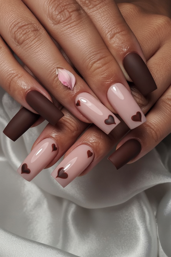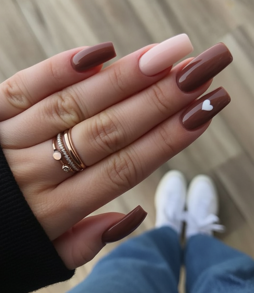 It has a flirty and cocoa tone of nail. The foundations comprise of sumptuous brown matte and creamy blush, against which the playful little hearts provide a special touch of personality, romance and are not cutely overdone. It’s a fall love letter wrapped in a manicure.