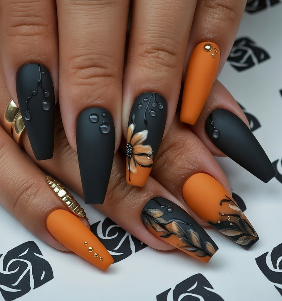 Talk about fall with a bold side! There is plenty of drama to this manicure as matte black and the bright pumpkin orange are combined with hand-painted florals and 3D dew drop accents. There is a bit of mystery-ultra-confidence to the contrast a bit as though a leather jacket was thrown over a flowing outfit in autumn. The nails enhance the effect by being in the shape of a coffin, and this does not seem to be a quiet look.