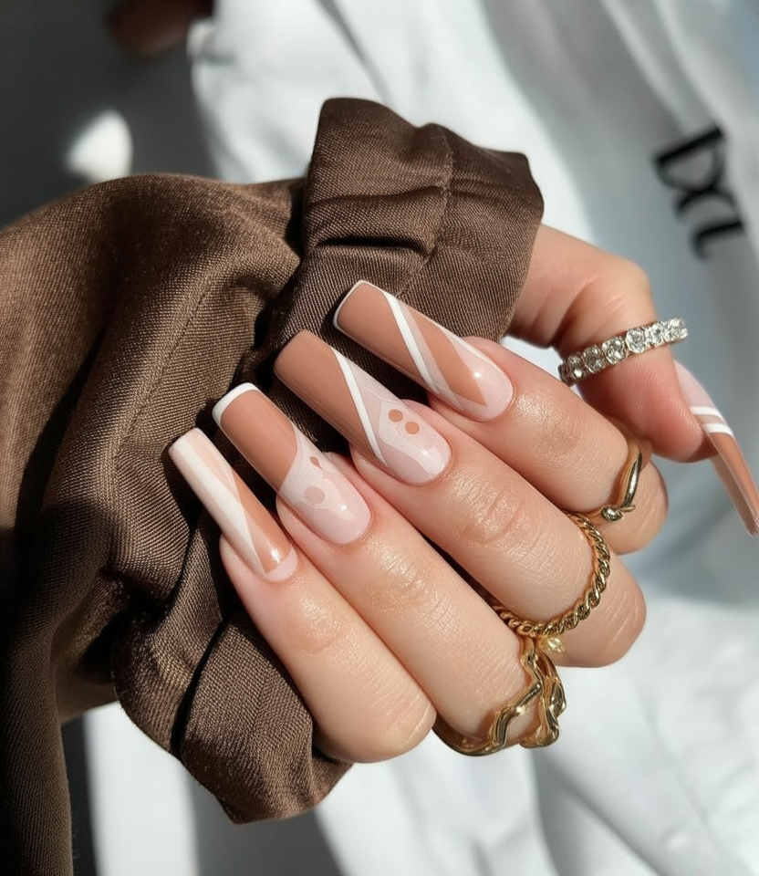 These nails are like an old postcard of the fall which is the best thing. Simplistic strokes of white parallel lines represent diagonal stripes, and dots designs form the frame of a neutral creamy outfit and add a very slight touch of the 2025 era. It is a light homage to retro, but it has been given a contemporary 2.0.