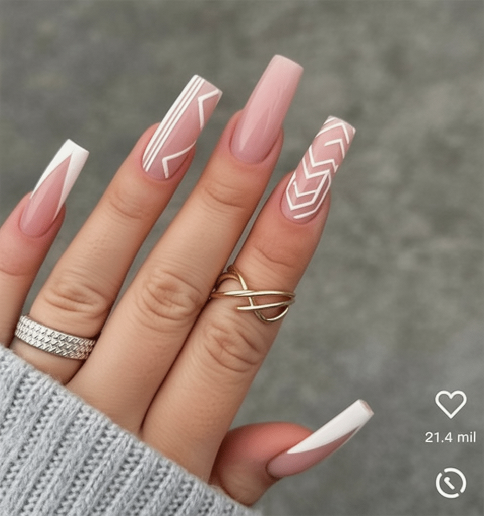 It is a modern interpretation of the French tip, no longer flouncy and ruffly but sharp and bold with a dose of graphic fun added to it. The neutral looking pink base allows the clean white linear designs to pop, and it feels like a modern art moment on every nail. It’s chic, architectural, and surprisingly fun for fall.