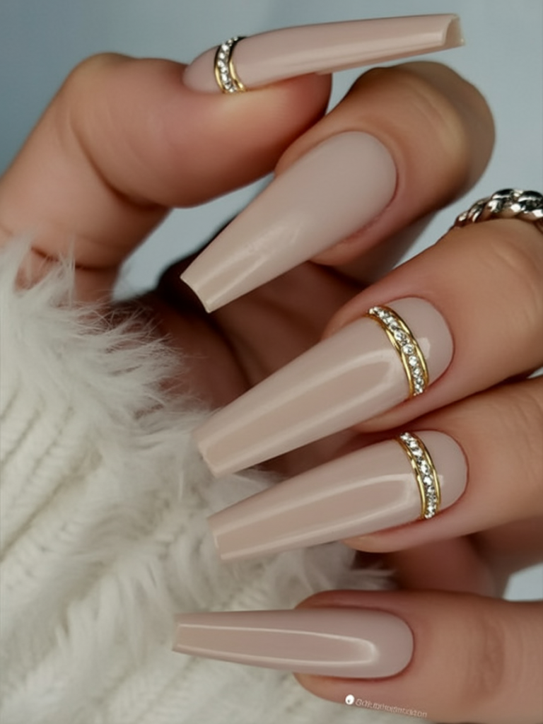 This is something to be worn on long coffin nails to bring out the effect of the contrast between the glitter and the gloss. It fits any skin color and style without intent and the gold tint makes it go perfectly with jewelry or warm tone clothes.