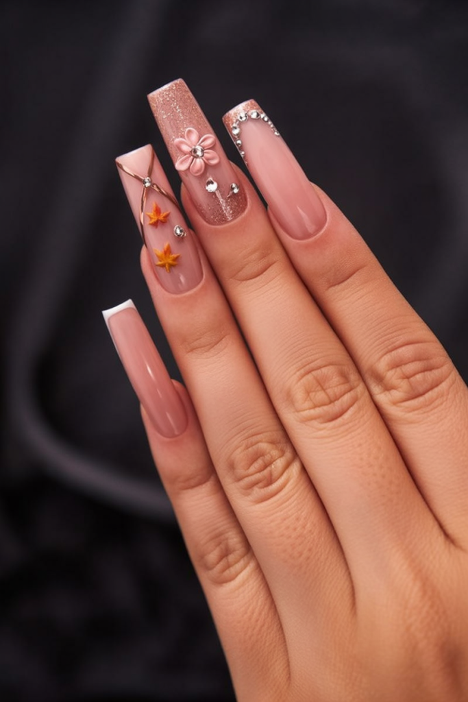 This manicure feels like fall in full bloom. This one has the deepest blush foundation so you get it all… 3D flowers, glitter, rhinestones, you even get delicate orange leaves. It is awfully specific yet romantic as a fall wreath made by hand turned into nail art.