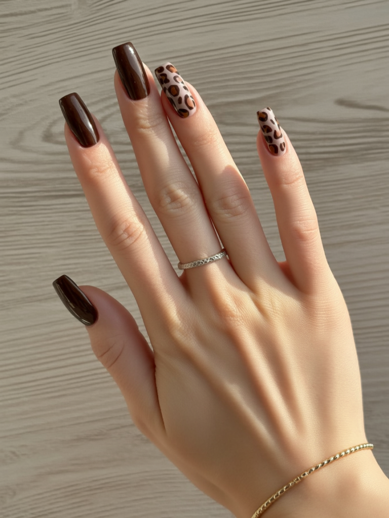 There’s something undeniably chic about a rich brown manicure paired with leopard print—it whispers “I know exactly what I’m doing.” The chocolate color drips the essence of fall comfort and the accent nails give a little pizzazz without being gimmicky. The coffin cut retains the entire effect elongated and elegantly formed as a cashmere scarf hanging in the right manner.
