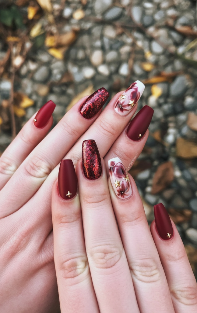 These nails are like rich fall romance in its full glory. In a striking red matte to jet sparkly, glitter, and translucent floral patterns with the tiniest gold accessory at the paths of stars. The variety of finishing glassy-matte makes this set look luxurious and story-like.
