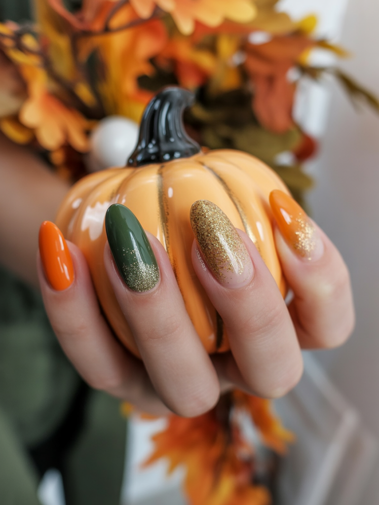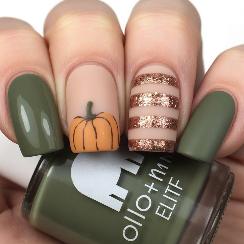 The olive green, copper sparkle and pumpkin owe an undisputed level of comfortability as well-it brings forth thought of hay rides, hot cider and soft scarves. It will deliver you the ideal dose of fall nostalgia with a twenty-first-century twist because you have vivid green polish combined with a witty pumpkin print and sparkling striping which is both celebratory and not over-the-top.