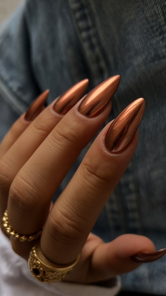 This metallic copper chrome look is pure fire. It exudes selfconfidence, strength and carries light as new pennies in the sun. The futuristic glam quotient is added by the shape of almond, which nevertheless is flattering and feminine at the same time.
