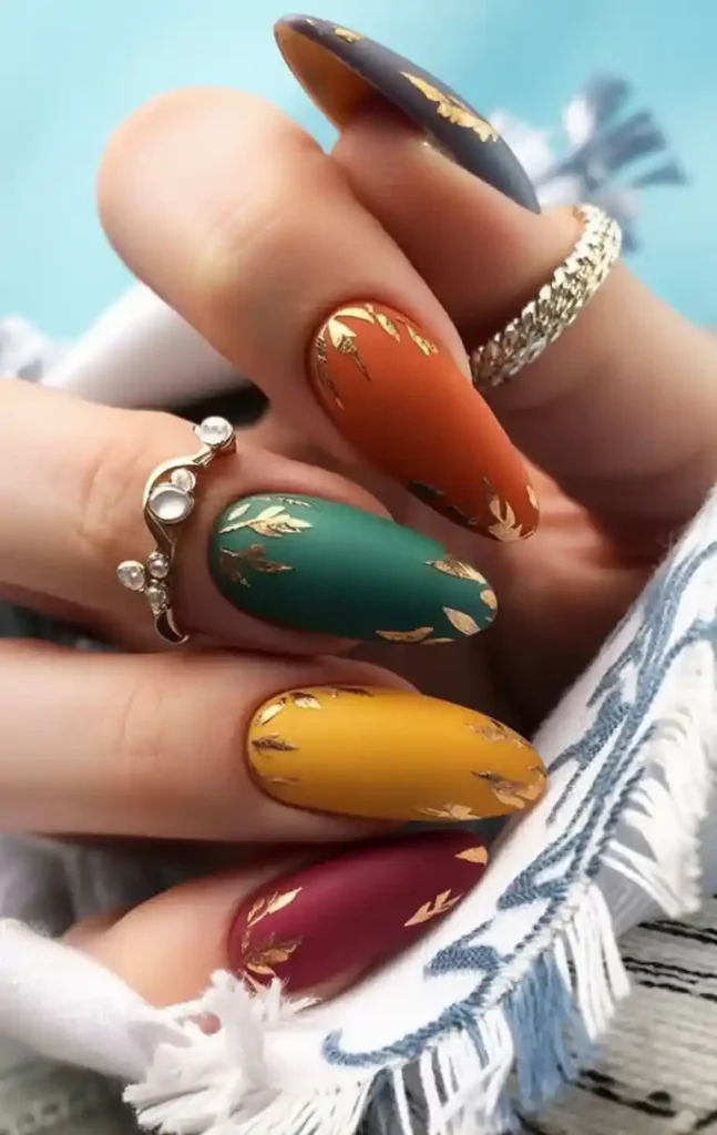 Similar to the feel of a bunch of autumn leaves, the nail set nails embody the brightest and brawniest colors of the season: burnt orange, mossy green and glittering gold. It is fresh, colorful and even somewhat magical, to go with the woman who is not afraid to use color.