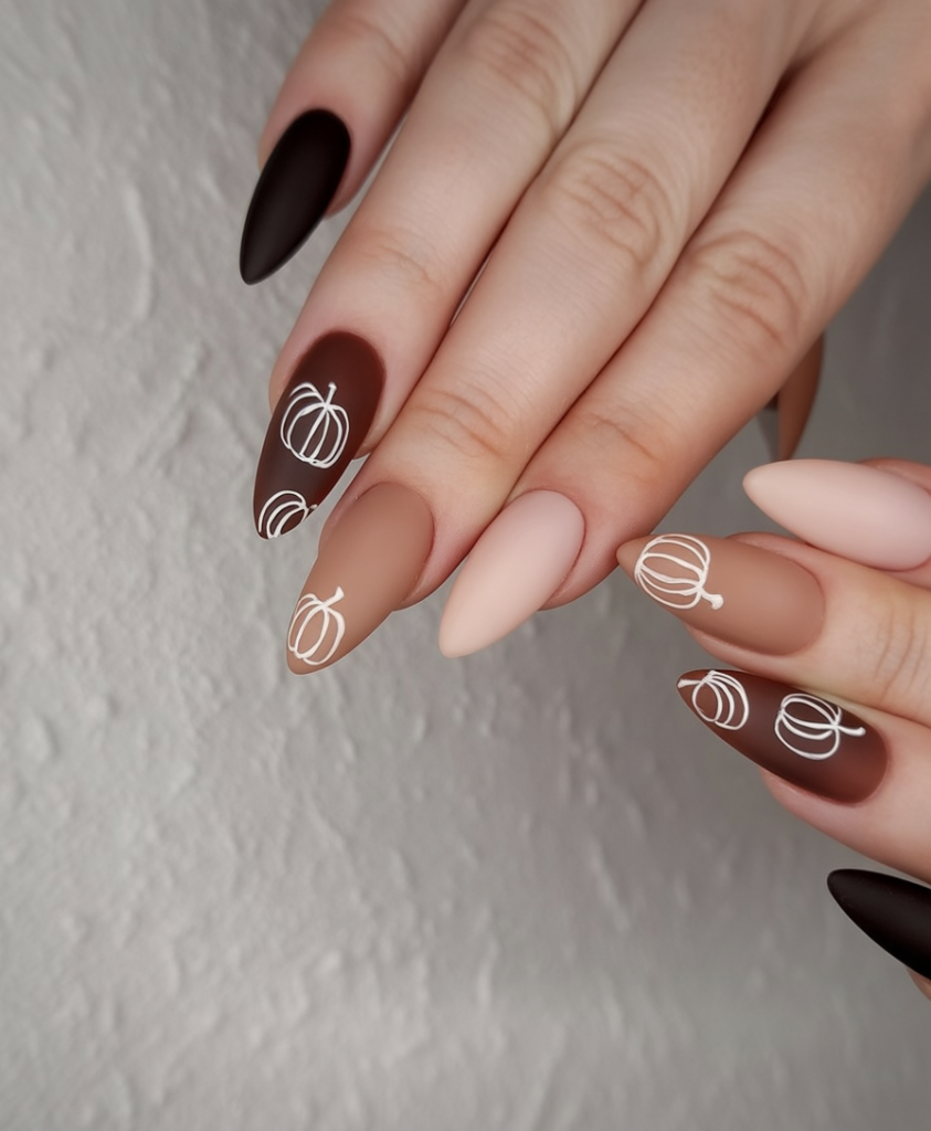 These nails have a subtle elegance that brings on autumn in candle lit cafe. The lightly coloured soft matte effect of layers of neutral tones is soothing and the white pumpkin lines are subtle but include a holiday mood without screaming.