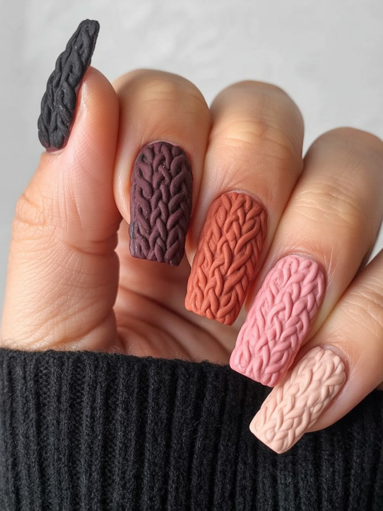 It is 3D fall comfort as nails, i.e., your favorite chunky knit sweater as nail art. The shade of each of the fingers is a variant of coziness, thus, forming a soft, warm, yet inherently stylish color palette.