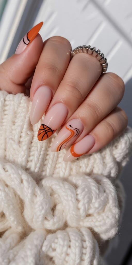 These are the funky nails that introduce the sports aspects of the fall beauty, being basketball-like with lines and curves. Pops of pumpkin orange mixed with soft nude bases keep the look seasonal without being too literal—it’s fun, flirty, and full of movement.