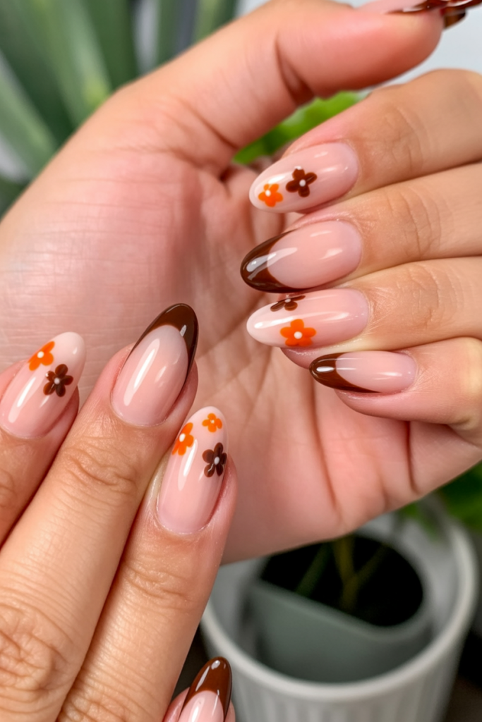 If you’re feeling retro this fall, these brown and orange daisies on nude French tips are pure groovy goodness. The pop of the flowers is just enough and it is not too crazy but the glossy finish and clean lines maintain the polished look.