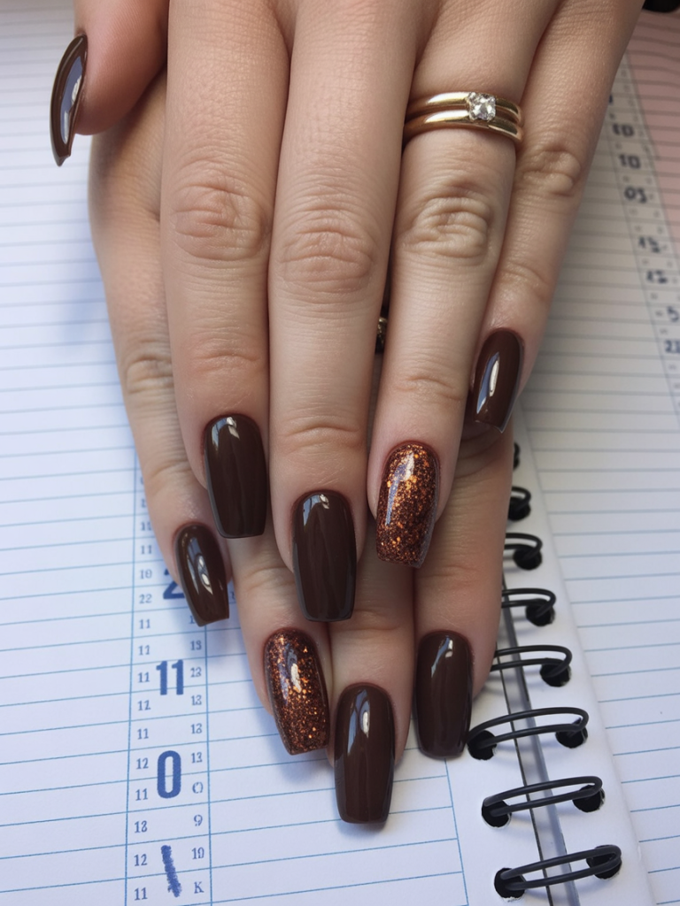 It is impossible not to feel the abundance of these espresso-colored nails with a copper glitter touch fused together- this color combination reminds molten chocolate being illuminated by autumn sun rays. This set is bold, elegant, and totally boardroom-meets-bonfire.