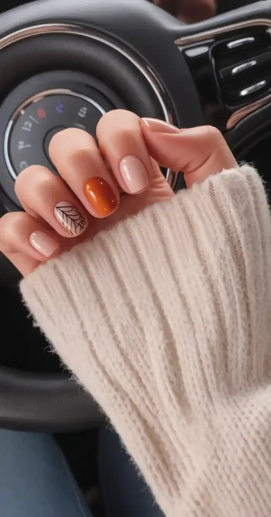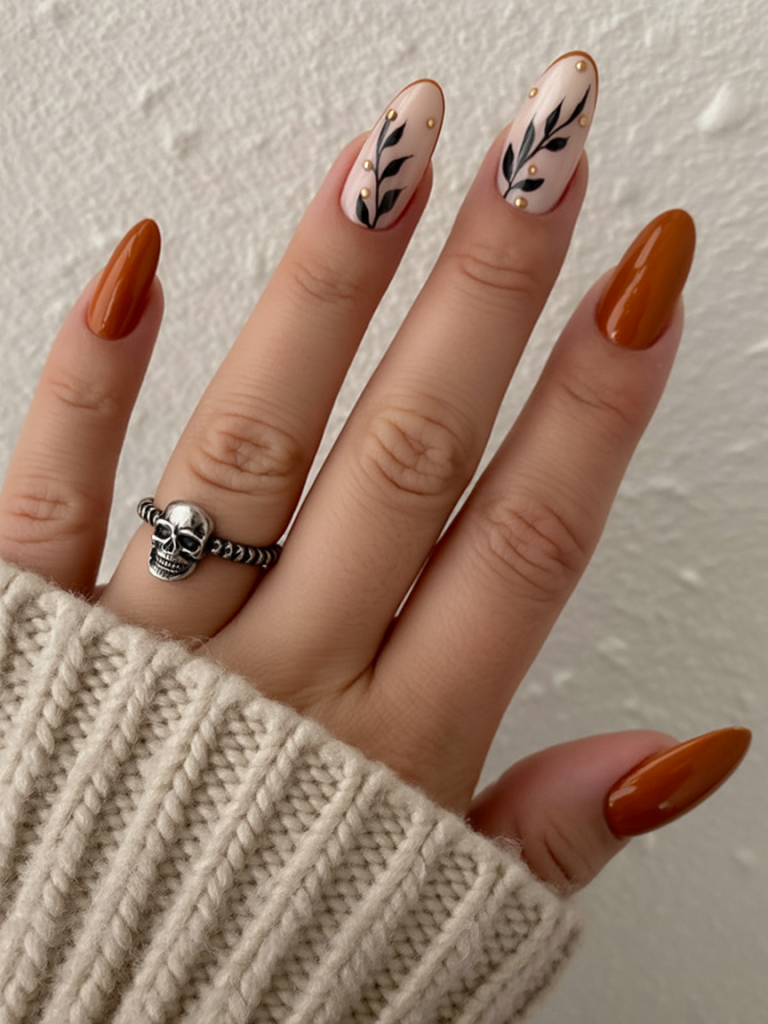 This is a comfortable manicure that is like wearing your favorite knit sweater. With warm brown tones on the outer nails and leafy black accents on soft blush pink, it’s a subtle nod to autumn’s natural rhythm—perfect for sipping tea on the porch or strolling through golden leaves.
