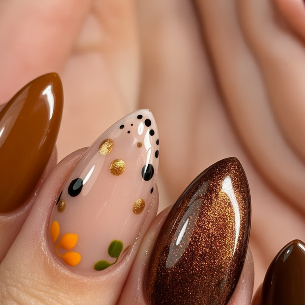 Analogous to a trail of leaves in a forest, this manicure goes all-in on fall the formulation of golden spots, black ink blots and foliage-y bits imparting a delicate murmur of harvest magic. Rich chocolate brown with the warm amber, every fingertip is a mini party.