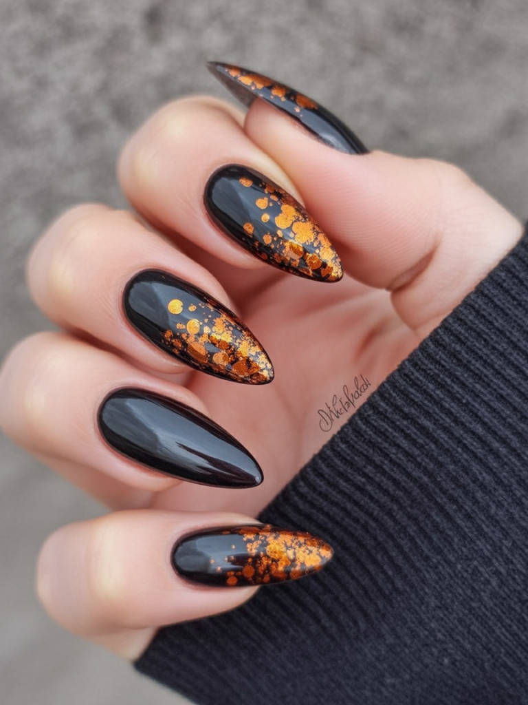 These nails are what happens when Halloween grows up. Black polish makes a shiny base and incredible copper and orange glitter bubbles bring some drama to it like autumn leaves in the moonlight. It’s edgy, glam, and just spooky enough.