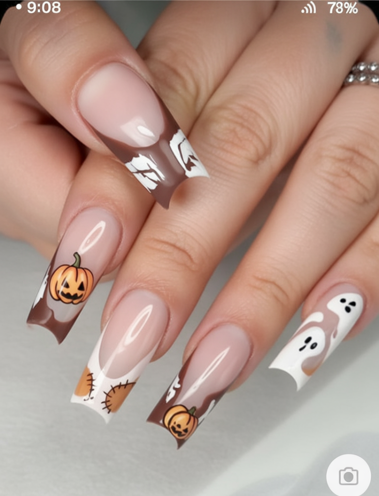 These nails remind me of the whole party of Halloween compressed in one of the stylish sets: ghosts, pumpkins, and scarecrows. The deep brown French tips are unexpectedly fancy and yet allowing the playful art to pretty well stand on its own. This is October spirit done in style.