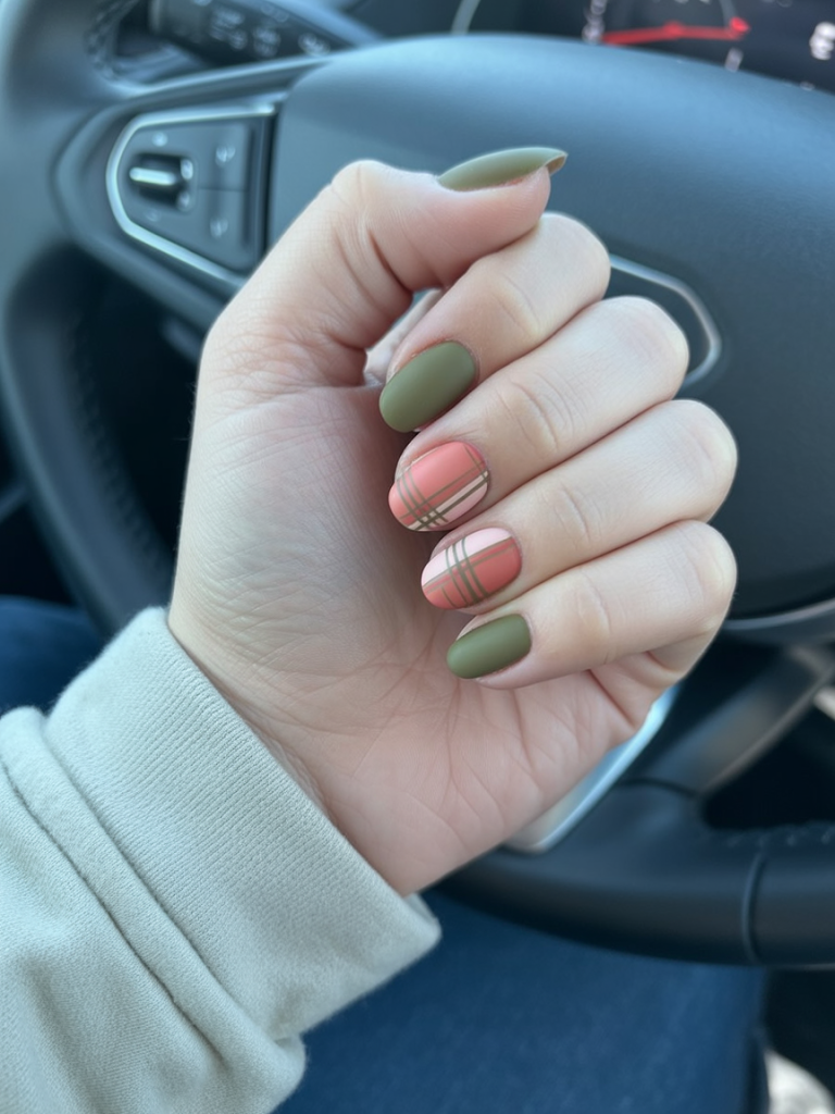 Meet the plaid nails you didn’t know you needed. The comfortable prep-school style of plaid combination has a relaxed character of olive and coral matte fabrics, which is very youthful and elegant at the same time. It is adorable and intelligent and really wearable even though you do not get into statement nail art.