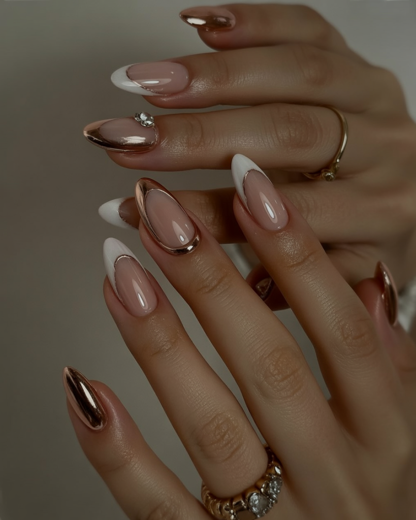This beautiful almond manicure is truly a show stopper and it adds an added layer of elegance to the classic French tip. Churning swirling rose gold chrome over nude foundations, and pure white overtones with one-crystal uplift bringing the whole concept to red carpet level.