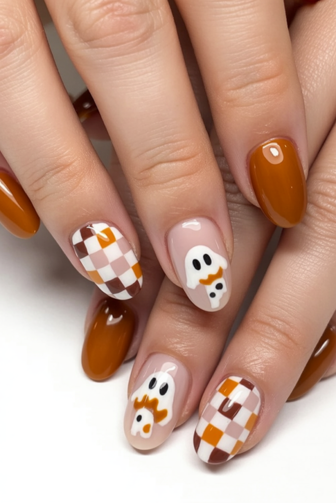 Such nails add a fun Halloween vibe to the typical fall look. The small ghosts are so adorable that you won t be scared of them and combined with soft plaid designs in warm amber, cocoa and cream color- they will be just about right. It is nail art that does not take itself too seriously, yet it still looks polished.